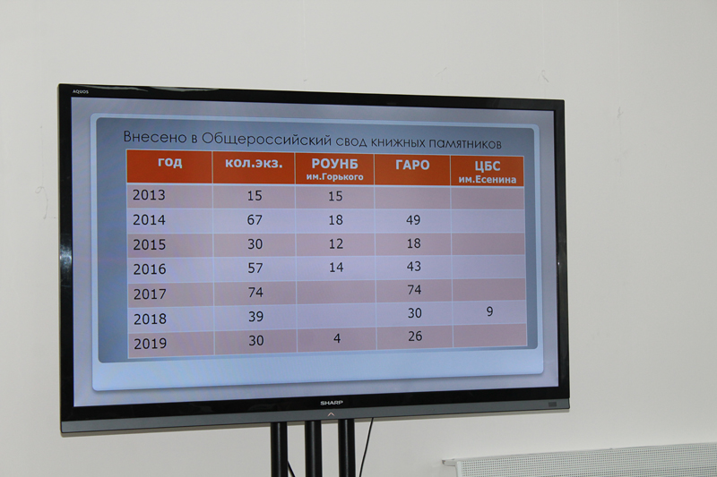 Вниманию членов совета было предложено выступление главного хранителя библиотечных фондов И.В. Антиповой о решении министерства культуры РФ по организации ведения реестра книжных памятников РФ. Для координации этой работы в регионах создаются экспертные советы на базе региональных центров по работе с книжными памятниками. Таким центром в Рязанской области является библиотека имени Горького, поэтому было предложено утвердить состав совета, в который вошли сотрудники библиотеки, Государственного архива Рязанской области и Рязанского государственного историко-архитектурного музея-заповедника «Рязанский Кремль». Приглашенный на заседание совета заместитель директора по научно-методической работе ГАРО Дмитрий Филиппов отметил, что необходимо работать с муниципальными музеями, библиотеками, храмами по выявлению имеющихся в их фондах книжных памятников.