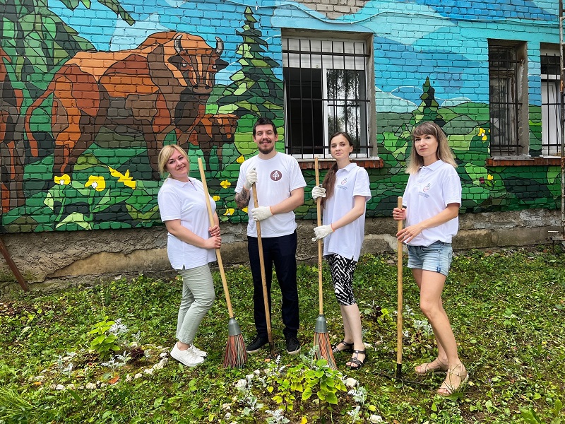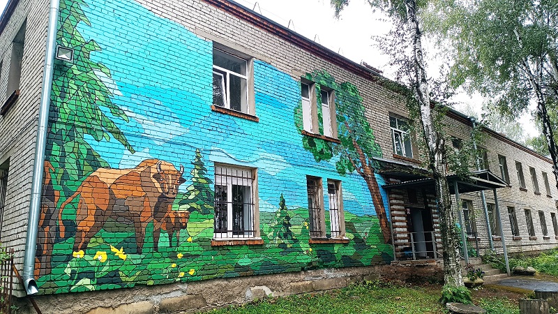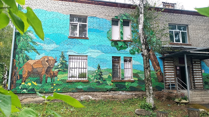 Сотрудники библиотеки совместно с волонтерами трудились несколько недель: решали организационные вопросы, проводили мастер-класс по рисованию для детей, арт-субботник и, конечно же, создавали сам мурал. Итогом нашей работы стал масштабный арт-объект, который получился ярким и красочным. Граффити изображает краснокнижных зубров в их естественной среде обитания. Мы уверены, что маленьким посетителям диспансера будет интересно посмотреть на великолепных животных, обитающих в нашем регионе. И надеемся, что благодаря нашей работе их впечатления от посещения лечебного заведения будут окрашены в радостные и веселые краски.