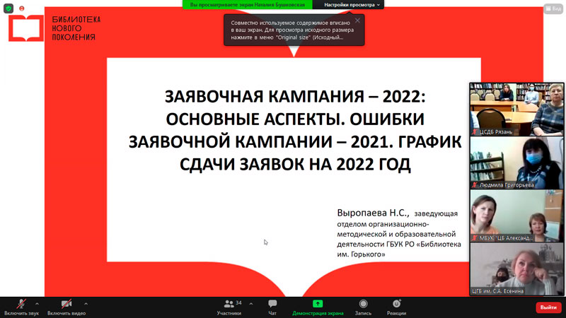 С приветственным словом к участникам обратилась Наталья Гришина, директор библиотеки им. Горького, руководитель регионального проектного офиса. Надежда Выропаева, заведующая отделом организационно-методической и образовательной деятельности, выступила с презентацией «Заявочная кампания – 2022: основные аспекты. Ошибки заявочной кампании – 2021. График сдачи заявок на 2022 год».