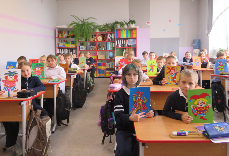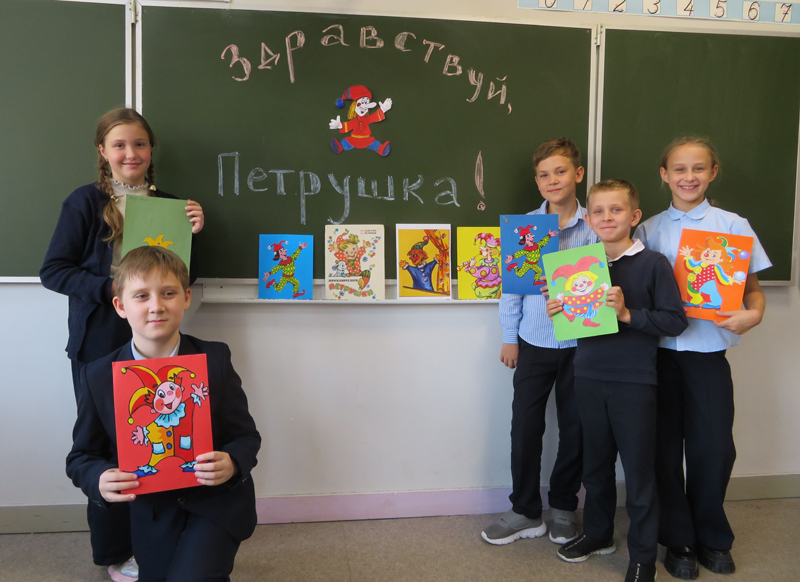 В конце урока учащиеся под руководством библиотекаря изготовили своими руками с помощью клея, цветного картона и бумаги декоративное панно с изображением Петрушки.