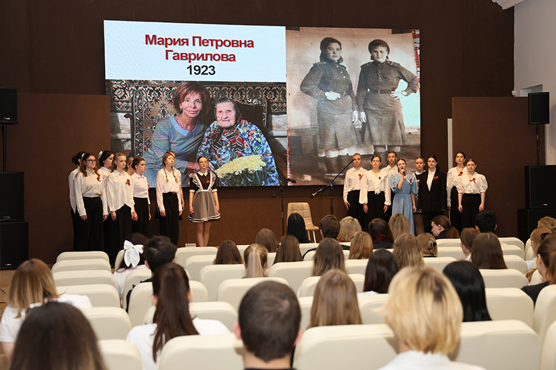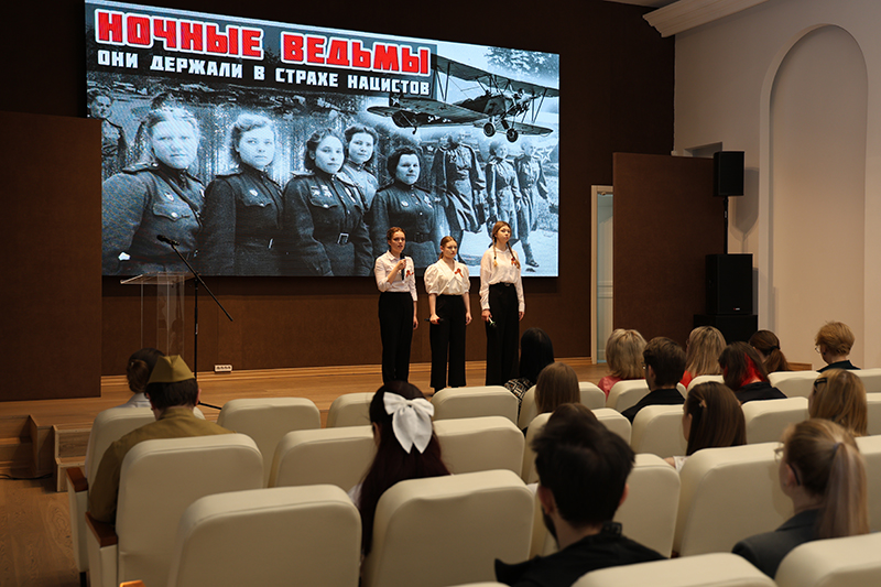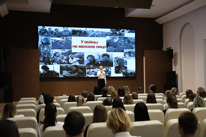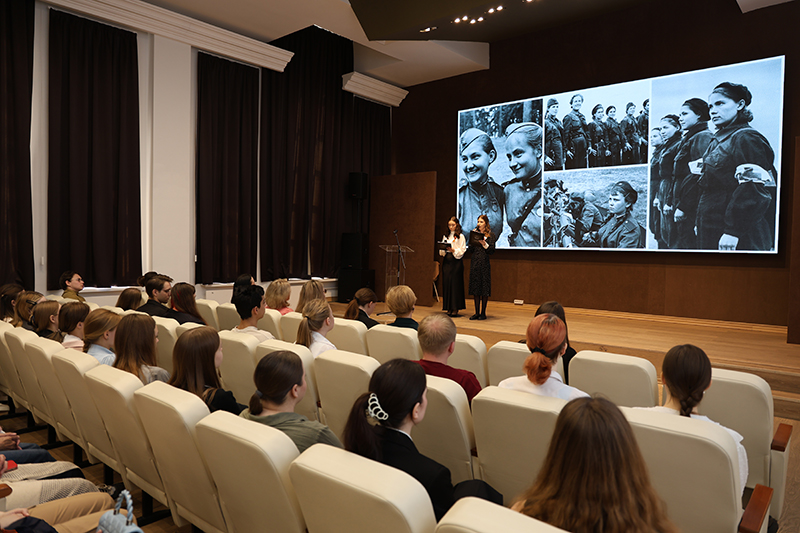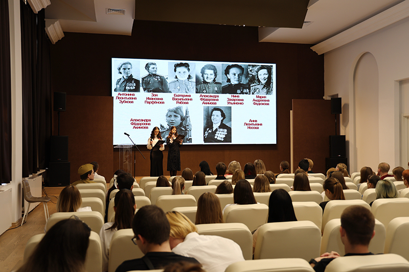 Студенты рассказали истории выдающихся женщин-фронтовичек. Среди них: поэтесса Юлия Друнина; морской десантник Екатерина Демина; первая женщина, удостоенная звания Героя Советского Союза во время Великой Отечественной войны, Зоя Космодемьянская; танкист Мария Октябрьская; снайпер Людмила Павличенко; член подпольной антифашистской организации «Молодая гвардия» Любовь Шевцова; санинструктор Зинаида Туснолобова; летчица Марина Раскова; певица Лидия Русланова и многие другие.
