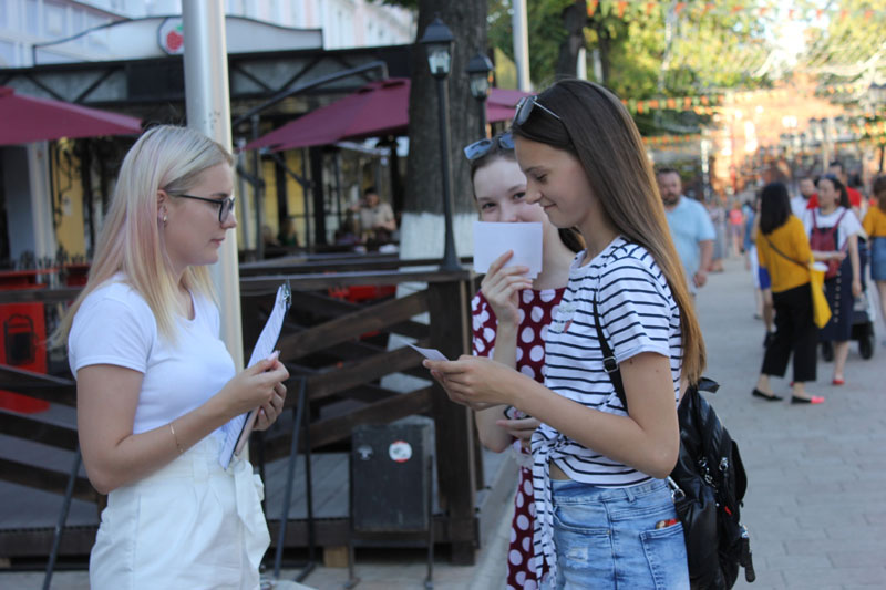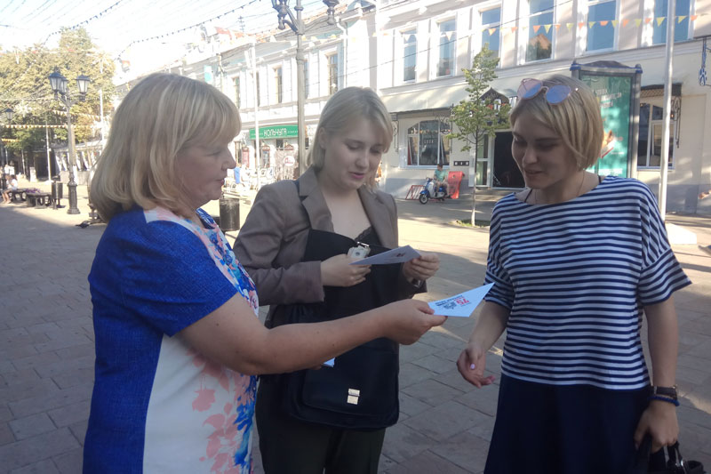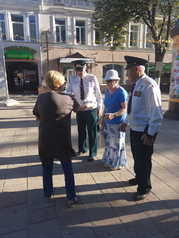 Сотрудники библиотеки предложили рязанцам и гостям города проверить свои знания о Великой Отечественной войне, ответив на задания викторин и решив кроссворд. Участники акции и прохожие получили «солдатские треугольники» с информацией о Курской битве, 75-летие которой отмечается в этом году, и памятные листовки «Рязанская область в годы Великой Отечественной войны» и «Рязанцы на фронтах Великой Отечественной войны».
