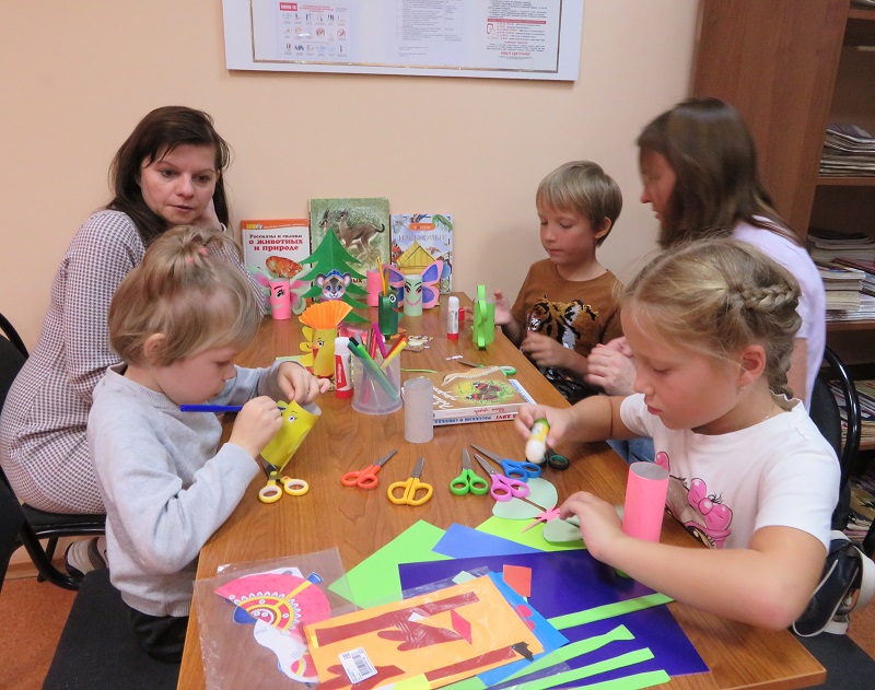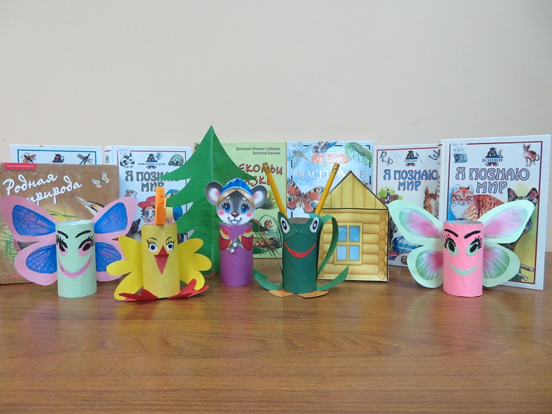 На занятии сотрудник кафедры детской литературы в игровой форме рассказала о том, какие животные и насекомые обитают в лесах, а кого мы относим к домашним питомцам. С помощью ножниц, клея, картонных втулок, фломастеров и цветной бумаги под руководством библиотекаря участники мастер-класса дружно изготовили петушка, мышку, котенка, кузнечика и бабочку.