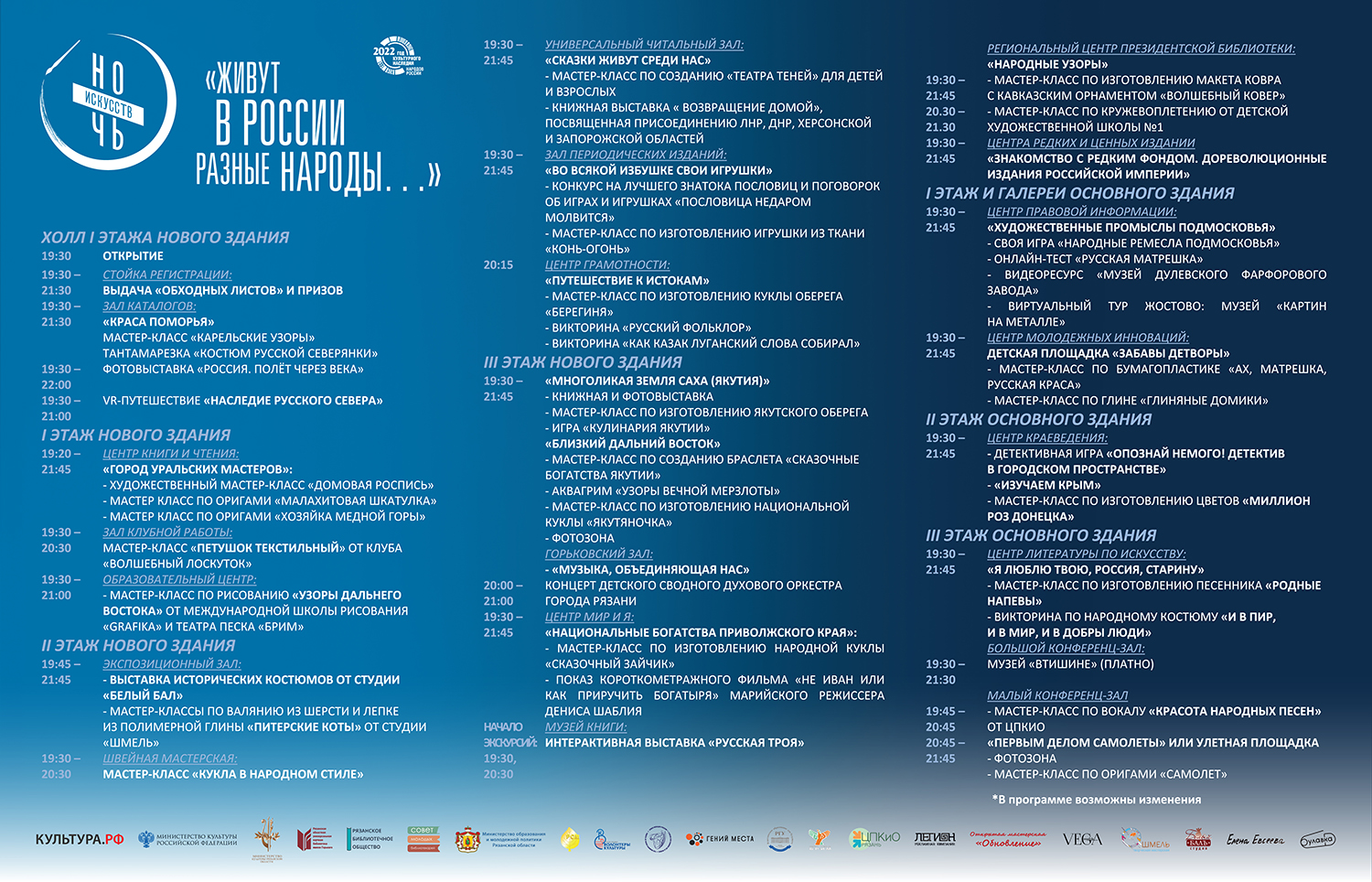 Народное искусство преодолевает любые расстояния. За одну ночь участники мастер-классов побывали во всех уголках необъятной России, от Невы до Амура. Они осваивали «Узоры Дальнего Востока» вместе с художниками школы рисования «GRAFIKA» и театра песка «БРИМ», валяли из шерсти «Питерских котов» вместе с преподавателями студии «Шмель», шили расписных петушков на площадке клуба «Волшебный лоскуток», осваивали домовую роспись Урала, орнаменты Кавказа и Поморья, создавали обереги и украшения Сахи (Якутии), изучали орнаменты Рязанского края вместе с художником-дизайнером Еленой Евсеевой, шили и скручивали традиционные рязанские куклы-обереги – к этому мастер-классу с удовольствием присоединилась почетная гостья «Ночи искусств», министр культуры Рязанской области Марина Владиславовна Кауркина.