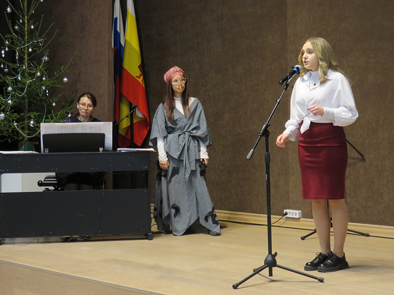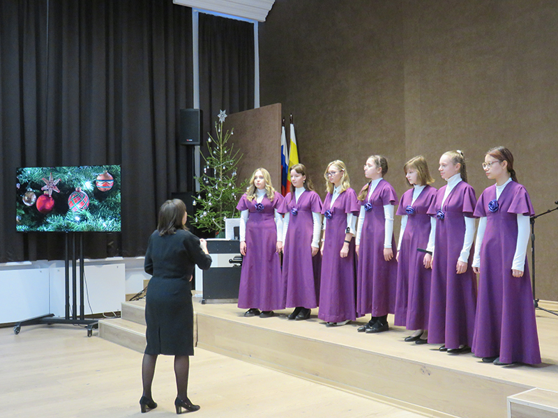 Праздничное представление украсили выступления хоровых коллективов школы и солистов под руководством преподавателей Елены Романовой, Татьяны Цыганковой и Надежды Юдаевой. Хор 1-го класса «Бусинки» (руководитель Т.В. Цыганкова) исполнил песни З. Роот «Что за чудо!», польскую народную – «Новый год», А. Ростовской «У кота» из цикла «Три хора на народные тексты» и А. Вискова «Здравствуй, добрый дедушка Мороз». Младший хор «Капель» (руководитель Н.Г. Юдаева) – песни Я. Дубравина «Всюду музыка живет»,