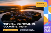 С 26 августа по 16 сентября 2024 года в рамках межведомственного культурно-образовательного проекта «Культура для школьников» пройдет Всероссийская акция «Торопец. Возрождение русской культуры», приуроченная к празднованию 950-летия первого летописного упоминания города.