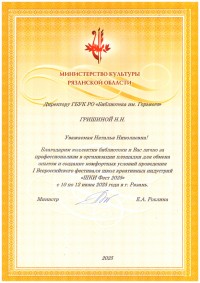 Министерство культуры Рязанской области направило благодарность коллективу Рязанской областной универсальной научной библиотеки и ее директору Наталье Николаевне Гришиной «за профессионализм в организации площадки для обмена опытом и создание комфортных условий проведения I Всероссийского фестиваля школ креативных индустрий “ШКИ Фест – 2025”».