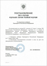 Совет Федерации принял на пленарном заседании постановление о назначении выборов президента РФ на 17 марта 2024 года, оно вступит в силу с момента официального опубликования.