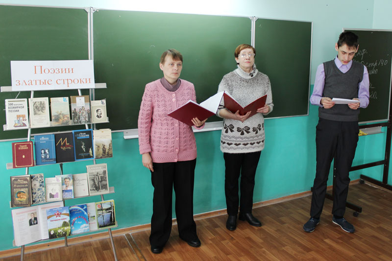 Восьмиклассники читали стихи А. Пушкина, С. Есенина, Р. Рождественского, А. Ахматовой, Т. Снежиной, А. Дементьева и многих других поэтов. Ведущий библиотекарь Марина Трохина познакомила школьников с книжной выставкой «Поэзии золотые строки».