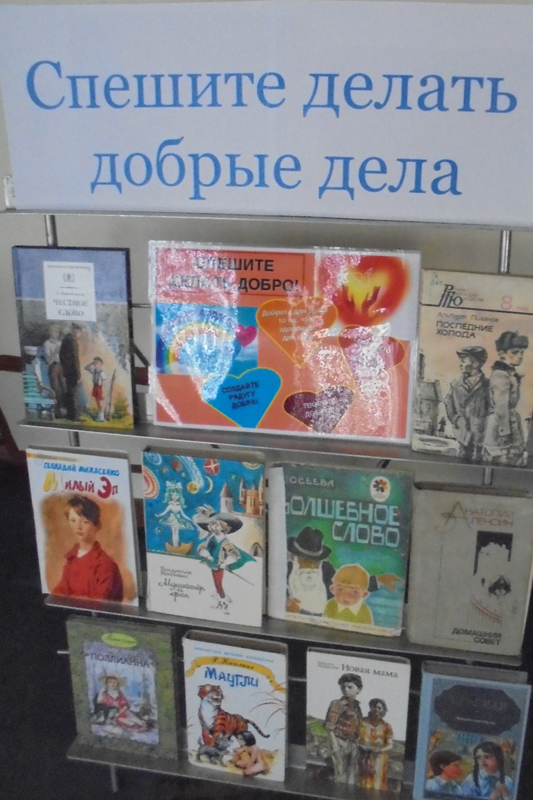 В фойе библиотеки была развернута книжная выставка под названием «Спешите делать добрые дела», на которой представлены книги В. Осеевой, А. Лиханова, А. Алексина, Л. Чарской. В них на первом месте добро, сострадание, помощь людям.
