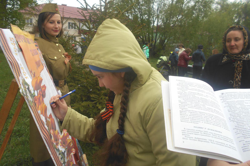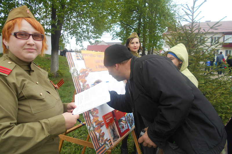 9 мая в рамках празднования Дня Победы сотрудники детской библиотеки Александро-Невского муниципального района провели акцию «Прочитал книгу о войне – стал ближе к подвигу». Библиотекари Г.Н.Зайченко и С.П. Кличановская, одетые в военную форму, предлагали жителям и гостям поселка написать на специально подготовленном стенде название прочитанных ими книг о Великой Отечественной войне. Все желающие охотно записывали строки из понравившихся им рассказов, повестей, романов, стихов, песен военной поры. На стенде были представлены книги писателей-фронтовиков, отрывки из которых зачитывали библиотекари. Эта акция собрала много положительных отзывов от юных и взрослых читателей.