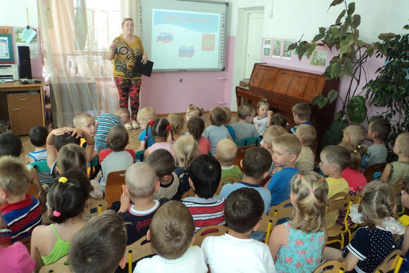 Ведущие мероприятия рассказали ребятам о том, что такое государственные символы, почему каждое государство имеет свой флаг, что он означает. Маленькие читатели с интересом знакомились с фотографиями на слайд-презентации и задавали вопросы: почему у российского флага такие цвета? что будет, если цвета на флаге перепутать местами?