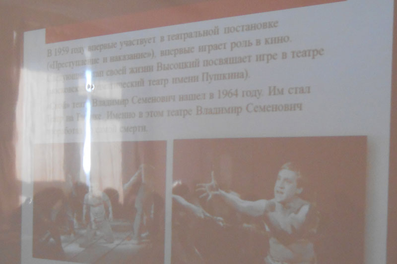 Ведущие вечера рассказали о жизни и творчестве В. С. Высоцкого. Школьники услышали воспоминания его отца, матери, друзей детства, коллег по работе. Слайд-шоу дополнило текстовую часть об известном барде, актёре театра и кино.
