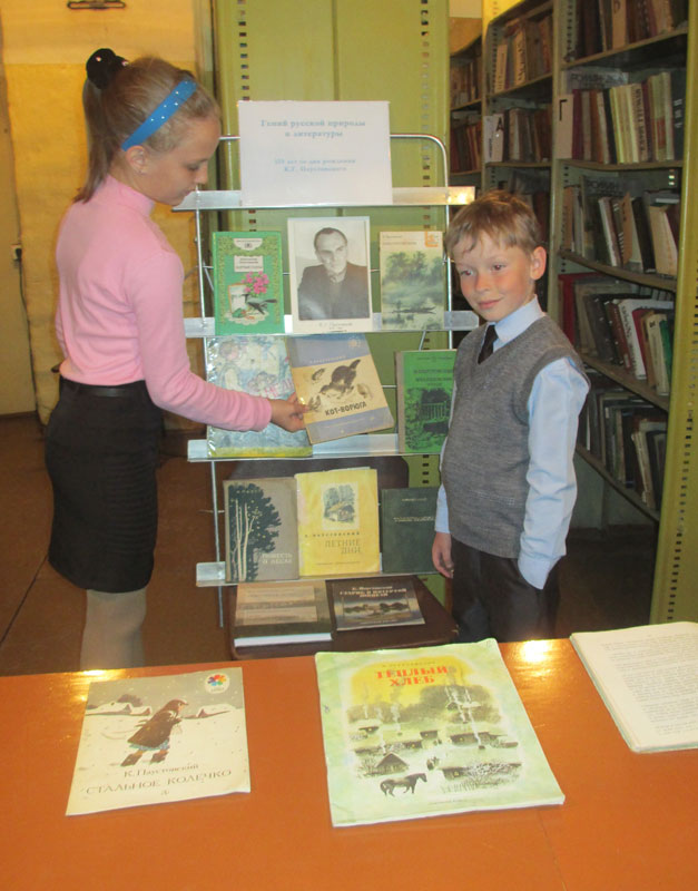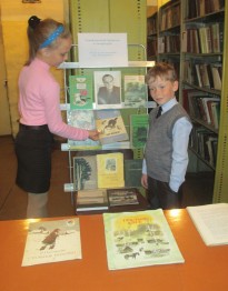Библиотекарь провела обзор книжной выставки «Гений русской природы и литературы». Ребята листали знакомые им произведения: «Теплый хлеб», Дремучий медведь», «Растрепанный воробей» и другие.