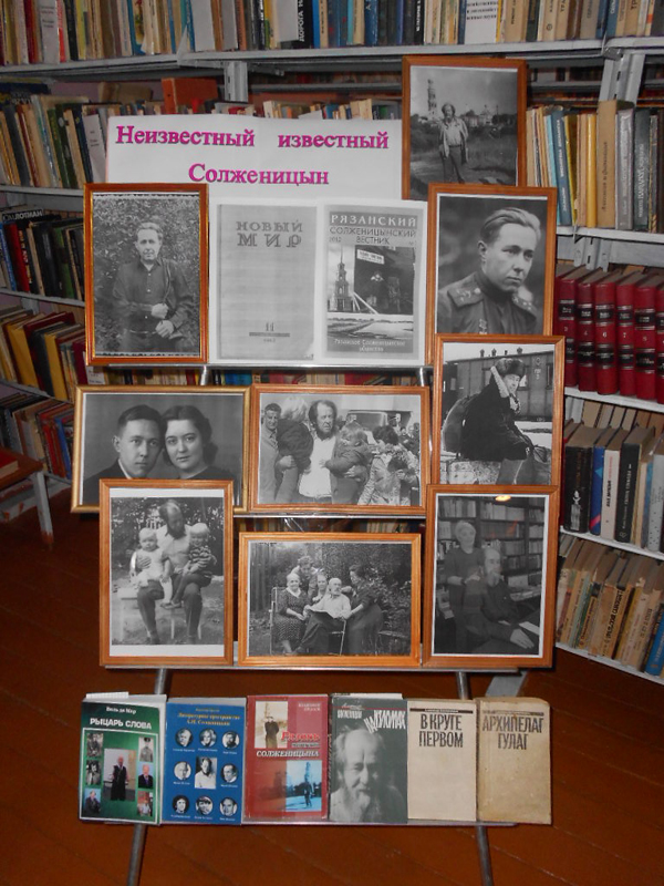 В библиотеке для читателей подготовлена выставка «Неизвестный известный Солженицын» с фотографиями, литературой о писателе, его книгами. Выставка передвижная, ее доставили к нам из Центральной библиотеки.
