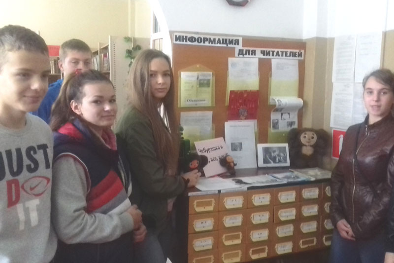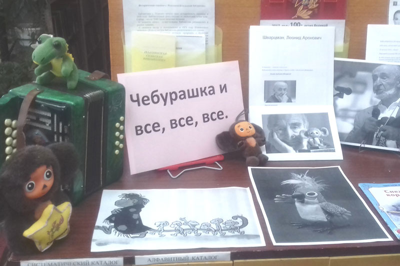 На книжной выставке «Чебурашка и все, все, все» были представлены Чебурашки-игрушки, Крокодил Гена с гармошкой и книги, которые читал Леонид Шварцман, создавая своих милых, добрых и любопытных героев.
