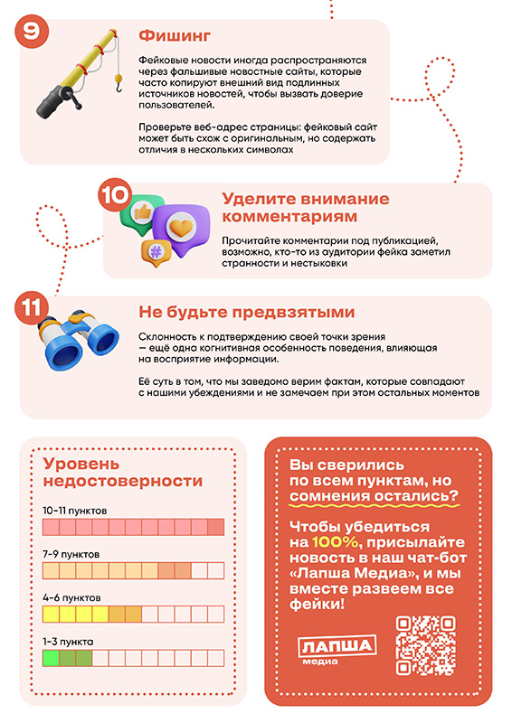 В рамках проекта «Лапша Медиа» создана серия видеороликов с базовыми принципами проверки информации на достоверность, которые объясняются доступным языком с избеганием большого количества профессиональной терминологии, а также разработан «Чеклист по фактчекингу» с указанием алгоритма верификации информации.