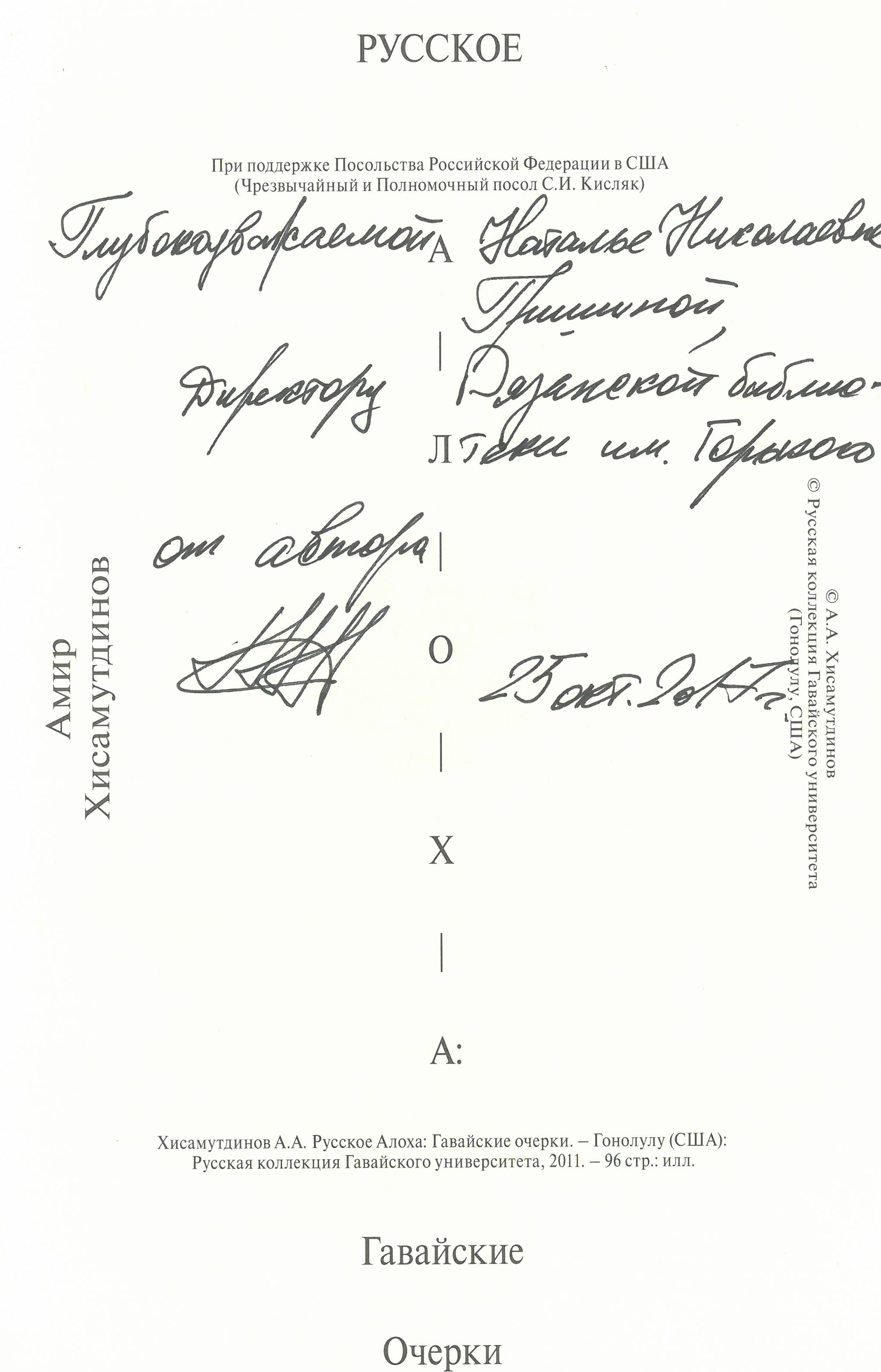 Амир Александрович Хисамутдинов, доктор исторических наук, профессор, заведующий отделом научно-исследовательской работы Центральной научной библиотеки Дальневосточного отделения РАН, автор более тридцати книг и ста научных статей по истории отношений между Россией и странами Азиатско-Тихоокеанского региона передал в дар библиотеке свою монографию «Русское Алоха: Гавайские очерки», лично адресовав ее директору РОУНБ им. Горького Наталье Николаевне Гришиной.