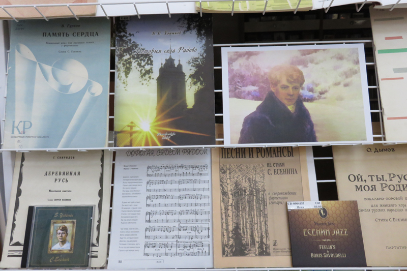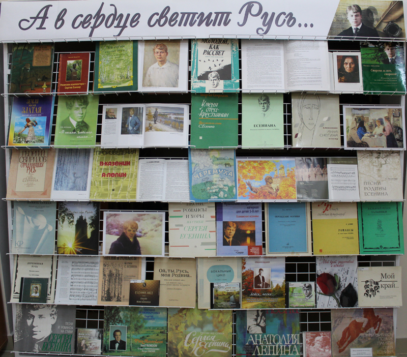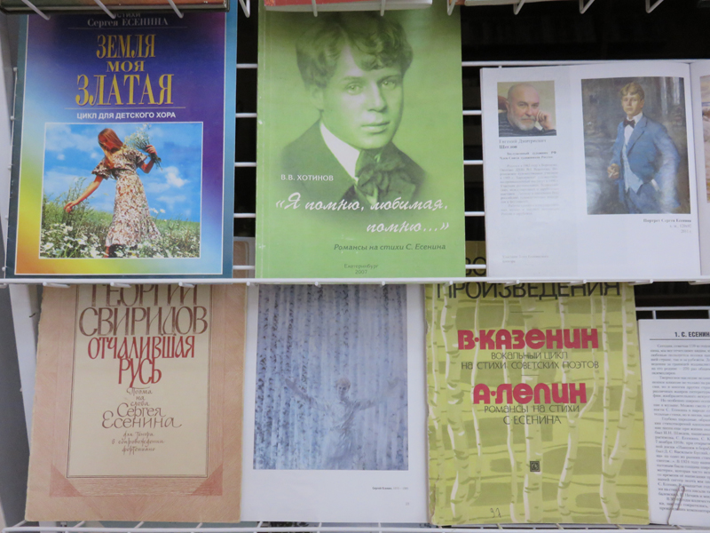 Среди нот, представленных на выставке, сочинения В. Гаврилина, Г. Пономаренко, детский хоровой цикл А. Пахмутовой «Земля моя златая» и другие сборники, включающие популярные романсы и песни на стихи Сергея Есенина. Наиболее полно они отражены в нотографических указателях Г. Иванова «Есенин в музыке» и Б. Розенфельда «Сергей Есенин и музыка». Также на выставке представлены диски и грампластинки с записями песен многих известных исполнителей.