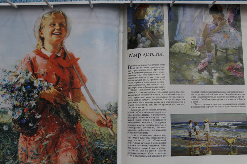 Представленные на выставке репродукции из альбомов, книг и журналов доставят читателям радость общения с прекрасным, близким и дорогим всем нам миром детства. Здесь можно увидеть самые разнообразные сюжеты из жизни маленьких героев: дети в семье, с родными, в школе, на природе, среди своих любимых игрушек, захваченные чтением, рисованием, игрой. Поклонников прекрасного ждет встреча с великолепным альбомом «Мой ангел», который вышел в издательстве «Белый город» и отпечатан в Италии. В нем собрано около 450 произведений отечественных живописцев, репродукции сопровождены стихами известных русских поэтов и писателей на тему детства.