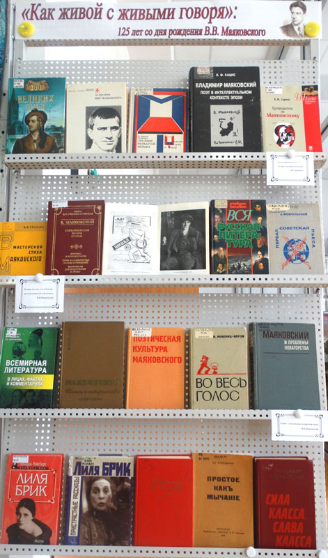 С 16 по 31 июля в Центре книги и чтения открыта выставка «Как живой с живыми говоря», посвящённая 125-летию со дня рождения Владимира Маяковского.