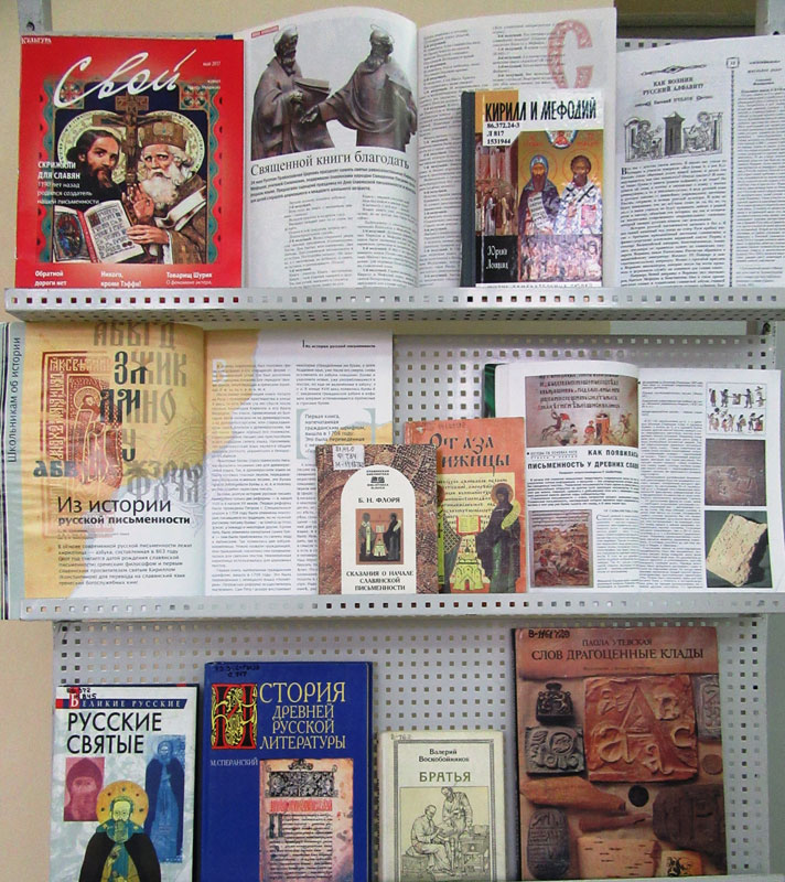 В 2017 году исполняется 1190 лет со дня рождения одного из первоучителей славянских – святого равноапостольного Кирилла. Историческая заслуга солунских братьев в том, что они составили славянскую азбуку, перевели с греческого на славянский язык богослужебные книги, способствовали введению и распространению славянского богослужения. На выставке представлены книги и периодические издания о происхождении славянской азбуки и развитии письменности на Руси, о выдающейся роли Кирилла и Мефодия.