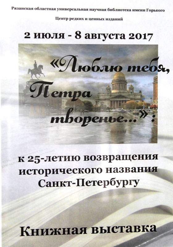 Центр редких и ценных изданийСо 2 июля по 8 августа в читальном зале Центра редких и ценных изданий работает книжная выставка, посвящённая 25-летию возвращения исторического названия Санкт-Петербургу.