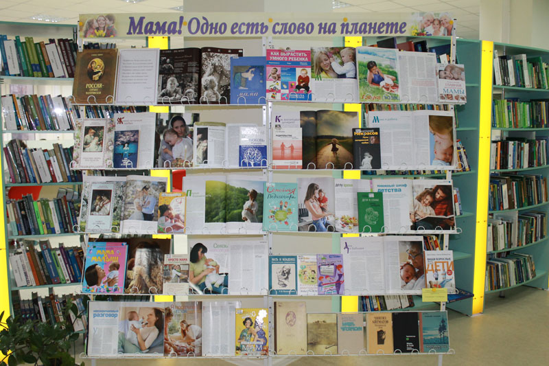 На выставке представлены книги и публикации из журналов, посвященные матери.