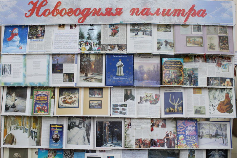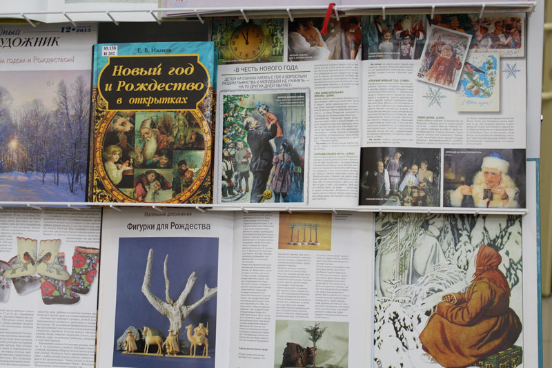 Выставка создает атмосферу зимнего праздника и предлагает читателям познакомиться с традициями встречи Нового года на Руси и в странах Европы и Азии.