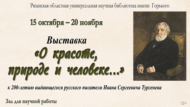 16 октября в 11.30 в зале для научной работы областной библиотеки состоится открытие выставочного проекта «О красоте, природе и человеке…». Проект посвящен 200-летию со дня рождения выдающегося писателя, поэта, мыслителя, общественного деятеля И.С. Тургенева.