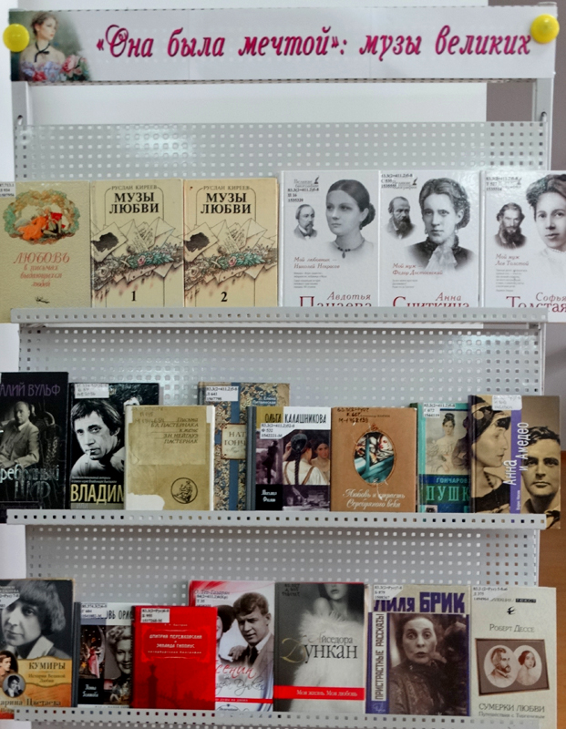В Центре книги и чтения работает выставка, на которой возвеличиваются музы Пушкина и Достоевского, Толстого и Чехова, Блока и Гумилева, Горького, Есенина, Маяковского, Уэллса, Булгакова, Дали… Этими книгами мы воздаем должное женщинам, которые вдохновляли самых прославленных гениев, и которым мы обязаны рождением бессмертных шедевров.