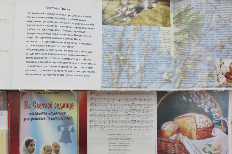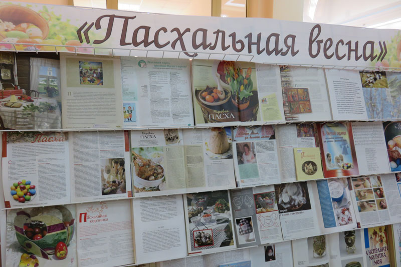 Выставка создает атмосферу радостного, светлого праздника. Представленные книги, альбомы, журналы и репродукции содержат великолепный материал о традициях встречи Пасхи на Руси, о праздничных обычаях, играх и развлечениях и о том, какие пасхальные украшения и подарки можно сделать своими руками.