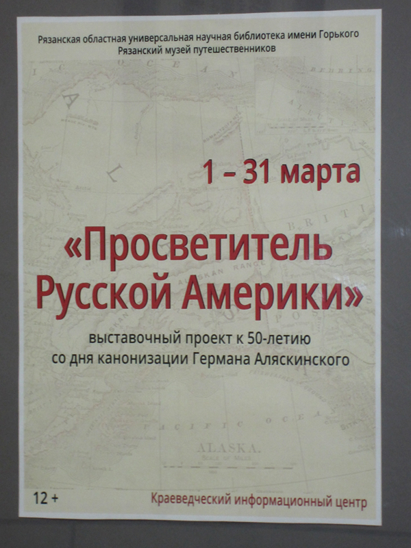 Краеведческий информационный отделВ краеведческом информационном отделе с 1 по 31 марта развернут выставочный проект «Просветитель Русской Америки» – совместная работа Рязанской областной библиотеки им. Горького и Рязанского музея путешественников.