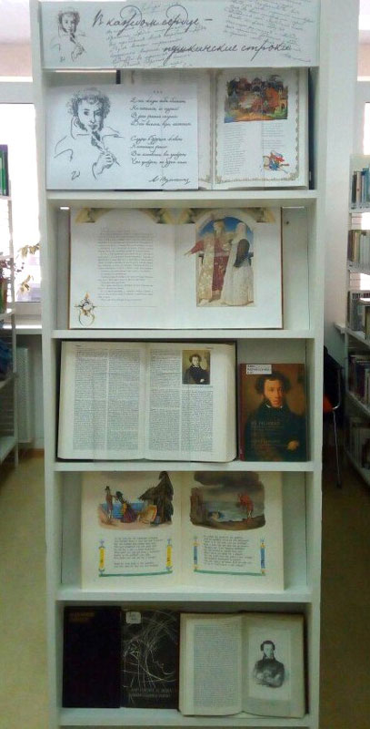 На выставке представлены произведения А.С. Пушкина на иностранных языках, а также информация о жизни и творчестве великого русского писателя.