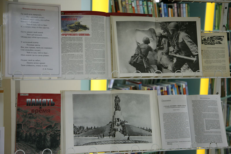 В универсальном читальном зале с 1 по 31 декабря работает книжно-иллюстративная выставка «Великой Армии простой солдат». На ней представлена документальная и художественная литература, рассказывающая о Великой Отечественной войне, подвигах солдат, оставшихся неизвестными, мемориальных архитектурных ансамблях «Могила Неизвестного Солдата» в Москве и других городах-героях, о военно-мемориальной работе за рубежом.