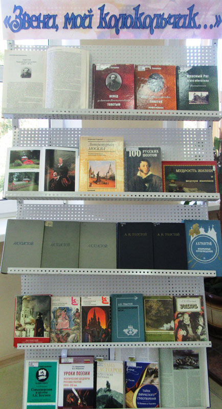 На юбилейной экспозиции поклонники таланта писателя найдут не только стихи, романы, но и дневники и письма автора, вошедшие в собрание сочинений Толстого в четырех томах (М., 1963–1964). Широко представлены сборники избранных произведений Толстого, опубликованные в разных сериях: «Тебе в дорогу, романтик», «Народная библиотека», «Классики и современники» и др. Сборник лирических произведений «Мудрость жизни и шедевры живописи» проиллюстрирован картинами знаменитых русских художников.