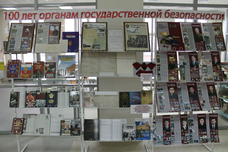 Важное место на выставке отведено книгам из фондов РОУНБ имени Горького, отражающим взгляд современных авторов на историю органов государственной безопасности, важнейшие операции, ими проведенные. Помимо этого, представлены биографии наиболее выдающихся деятелей спецслужб.