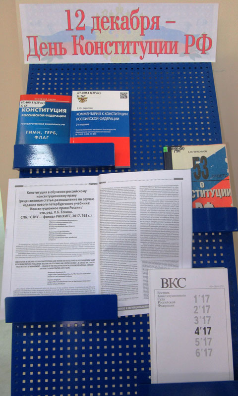 На выставке представлен текст Конституции, комментарии и сборник ответов на вопросы граждан России. На страницах журнала «Конституционное и муниципальное право» рецензируется новый петербургский учебник «Конституционное право России». Думается, посетителям будет интересно и полезно познакомиться с периодическим изданием «Вестник Конституционного Суда Российской Федерации», публикующим в хронологическом порядке тексты решений и посланий Конституционного Суда, особых мнений судей, а также другие материалы.