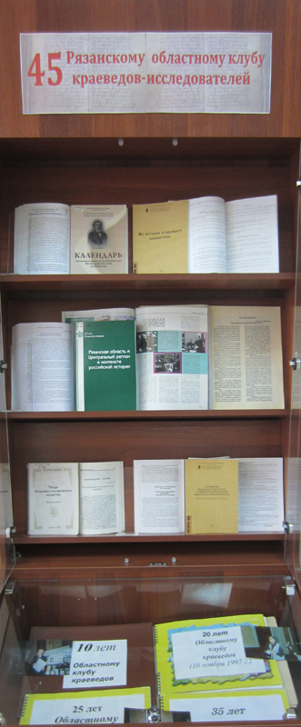 В экспозиции представлены издания, рассказывающие об истории создания клуба и его участниках – ученых, преподавателях, аспирантах, студентах, краеведах. Среди них – статья главного библиографа РОУНБ им. Горького Владимира Борисовича Серебрякова, стоявшего у истоков создания нового клуба, «Рязанскому клубу краеведов минуло 20 лет», напечатанная в журнале «Рязанский следопыт» за 1999 год. Особое место на выставке отведено фотоальбомам, отражающим этапы деятельности клуба краеведов-исследователей в разные годы.