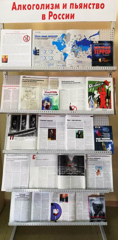На выставке представлены статьи из журналов и книги с информацией о проблемах алкоголизма в России, профилактике пагубного пристрастия и современных методах лечения страшного заболевания.
