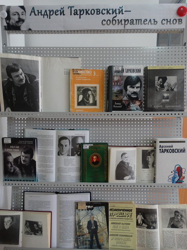 На выставке представлена литература о жизни и творческом пути Андрея Тарковского, информация о его фильмах и любимых актерах, поэзия Арсения Тарковского – отца режиссера.