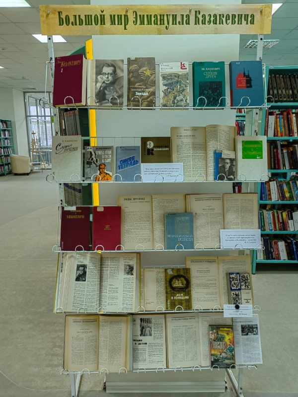 В универсальном читальном зале работает книжно-журнальная выставка «Большой мир Эммануила Казакевича». На ней представлены произведения писателя, книги о его жизни и творчестве, воспоминания современников, письма.