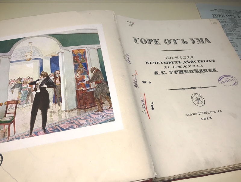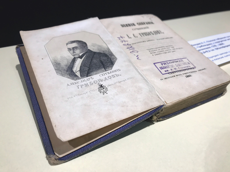 К юбилею писателя в Центре редких и ценных изданий организована книжная выставка. Внимание посетителей привлекут изящное малоформатное (12,8×8,2 см) издание полного собрания сочинений А. С. Грибоедова 1860 г., факсимильная копия первого отдельного издания комедии «Горе от ума» 1833 г., а также роскошное библиофильское издание комедии 1913 г. с многочисленными иллюстрациями Дмитрия Николаевича Кардовского (1866-1943), имевшего в начале XX века репутацию одного из лучших русских книжных графиков. Издание дополнено факсимильным воспроизведением афиши первого представления комедии в Петербурге 26 января 1831 г. и нескольких листов рукописи автора и рукописных списков комедии.