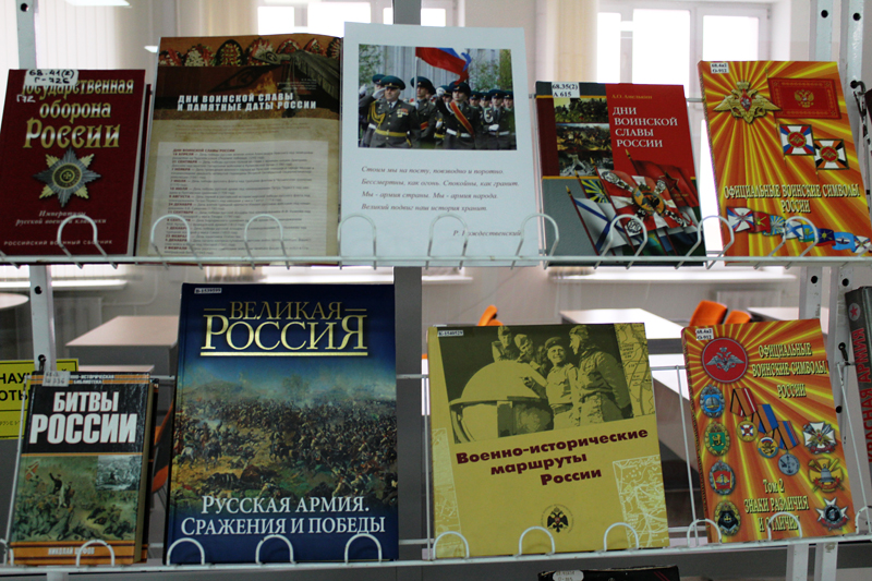 Книги, представленные на выставке, познакомят читателей с историей создания Российской армии и ее славными победами, расскажут о великой миссии, которую несет русский солдат, о почетной обязанности молодых людей служить в современной армии.