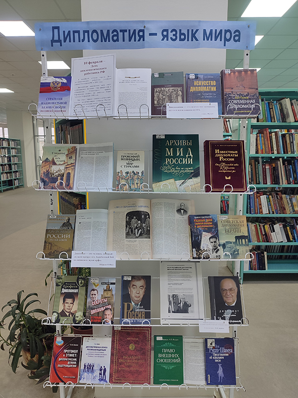 К этой знаменательной дате в универсальном читальном зале оформлена книжная выставка, на которой представлена литература об истории дипломатии, мемуары видных представителей дипломатического корпуса России и новых тенденциях развития современной дипломатии.