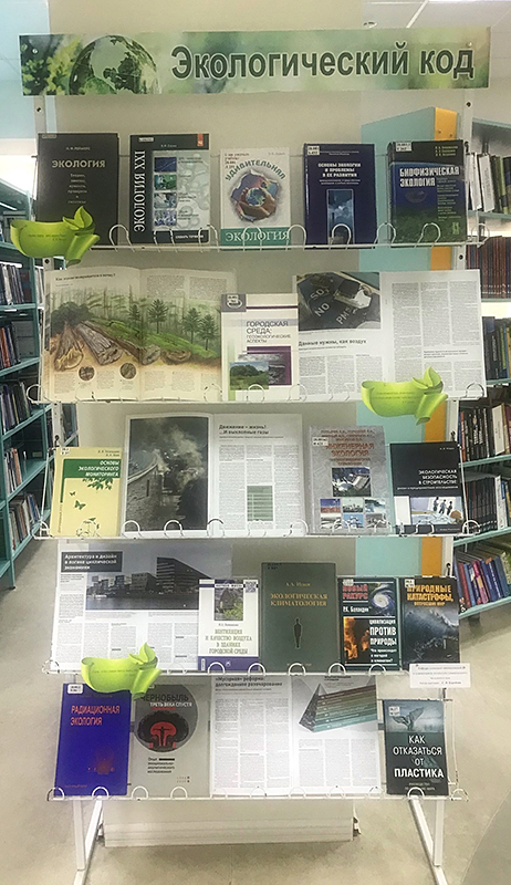 В универсальном читальном зале работает книжная выставка «Экологический код». На ней представлена литература, рассказывающая о понятиях экологии, ее принципах и закономерностях, о разделах и направлениях данной науки. Часть экспозиции посвящена экологическим катастрофам, как природным, так и техногенным, проблемам загрязнения окружающей среды.