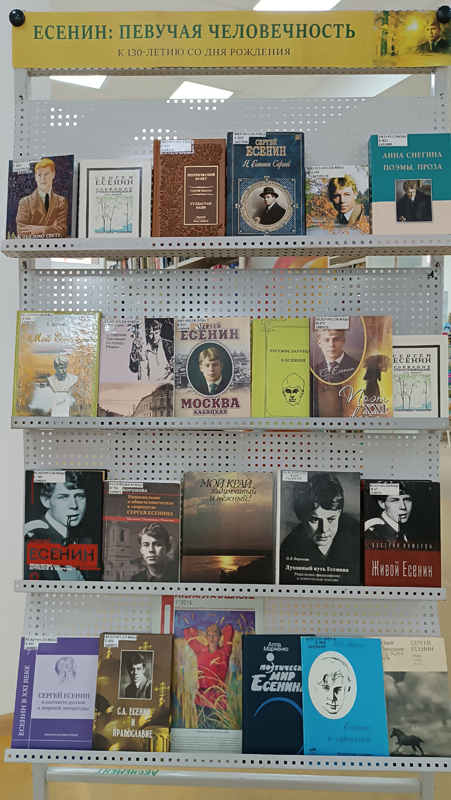 Литература, представленная на выставке, знакомит читателей с лучшими произведениями знаменитого поэта, а также рассказывает о непростом жизненном и творческом пути Есенина. О поэте рассказывают О.А. Лекманов, А.Н. Потапов, О.Е. Воронова, В.И. Астахов, Ю.В. Блудов и другие.