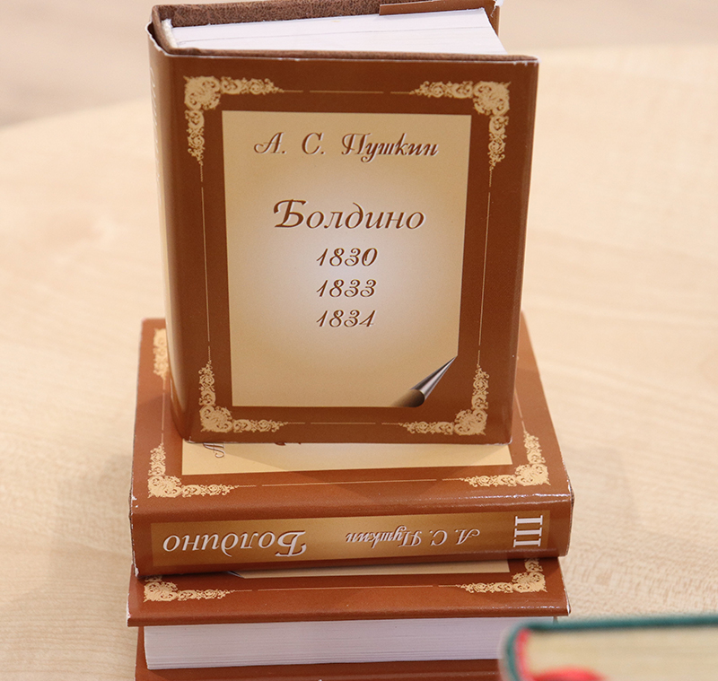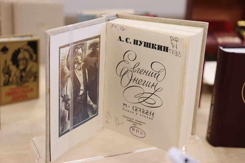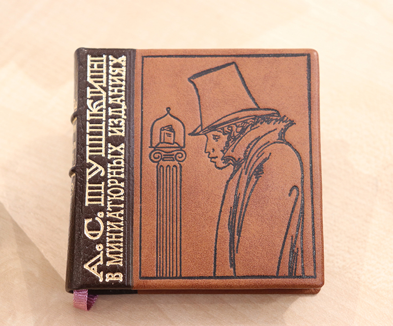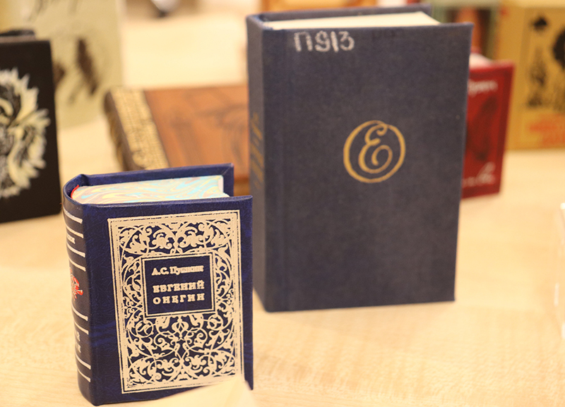 «Пиковая дама» и «Песнь о вещем Олеге», «Медный всадник» и «Маленькие трагедии», «Барышня-крестьянка» и «Руслан и Людмила», «Сказки», «Эпиграммы и миниатюры» – вот только часть названий из этой обширной коллекции! Многотомные сборники избранных произведений, крошечный «Талисман» размером 2х2,5 см. Есть факсимильное издание 1892 года повести «Дубровский»! А «самое задушевное произведение» Пушкина – роман в стихах «Евгений Онегин» – представлен сразу в нескольких изданиях, да каких! Самое ценное – факсимильное воспроизведение романа 1837 года, можно сказать, родоначальник миниатюрных изданий поэта. Оно было выпущено тиражом в 5000 экземпляров и распродано буквально за две недели после трагической гибели Пушкина. А самое красивое издание пушкинианы в миниформате – томик в футляре из настоящей бересты!