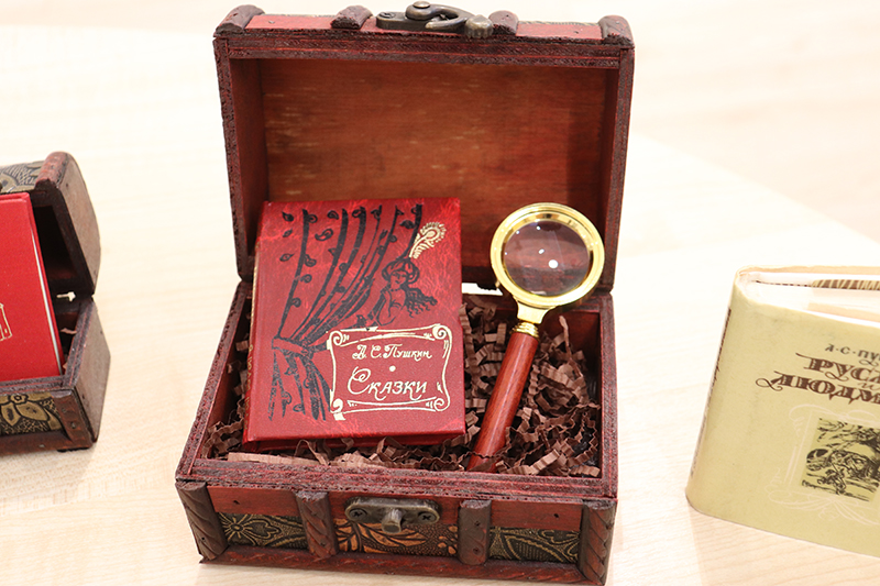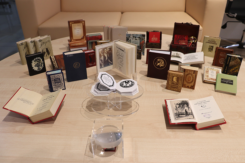 Кто из нас не любил в детстве слушать сказки Александра Сергеевича Пушкина? Кто не переживал за Татьяну Ларину, читая роман в стихах «Евгения Онегина»? Томики произведений гения русской литературы стоят в каждом доме на книжных полках, и часто тянется к ним рука, чтобы найти в бессмертных строках ответы на многие вопросы... Красочные большие издания, элегантные многотомники, яркие детские книжки – а доводилось ли вам держать в руках томик «Евгения Онегина» размером чуть побольше спичечного коробка, да ещё и «проживающего» в небольшом сундучке с лупой, чтобы было легче прочитать знакомые строки? Более 50 экземпляров включает в себя наша миниатюрная пушкиниана, являющаяся поистине жемчужиной нашей коллекции миниатюрных и малоформатных книг.