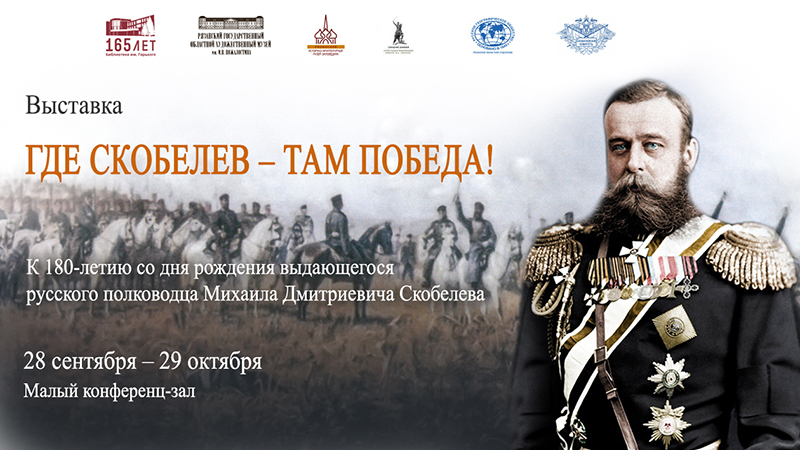 Малый конференц-залРязанская областная библиотека имени Горького совместно с Рязанским историко-архитектурным музеем-заповедником, Рязанским государственным областным художественным музеем имени И.П. Пожалостина, музеем-усадьбой «Мемориальный комплекс М.Д. Скобелева» Александро-Невского муниципального района Рязанской области, Рязанским областным отделением Русского географического общества представляют выставочный проект «Где Скобелев – там победа!».